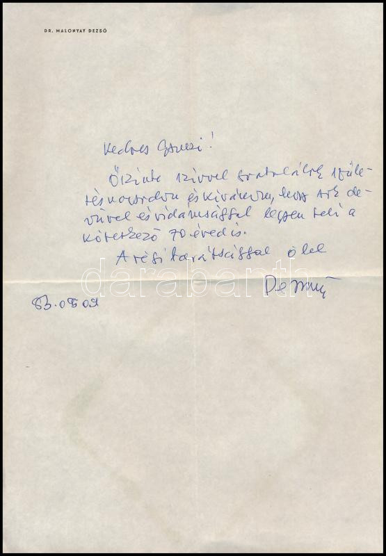 Malonyai Dezső (1921- 2004) színész, gazdasági vezető, színigazgató. a... https://www.darabanth.com/hu/441-Gyorsarveres/441.0/Mutargy-papirregiseg-egyeb/Tortenelmi-dokumentumok-keziratok-erdekessegek~500023/Malonyai-Dezso-1921-2004-szinesz-gazdasagi-vezeto-szinigazgato-autograf-levele~II2898490