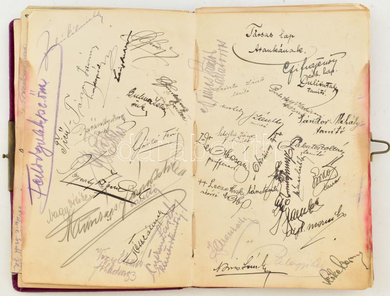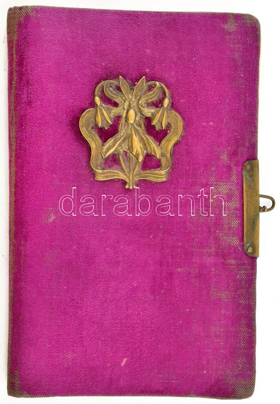 cca 1930 Nyírbátor, emlékkönyv számos bejegyzéssel és aláírással, néhány kevés rajzzal, szecessziós-florális rézverettel díszített, kopott vászonkötésben, laza fűzéssel