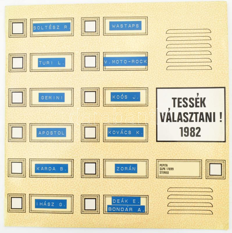 Vinyl, LP, Összeállítás, Sztereo. Pepita. Ma... https://www.darabanth.com/hu/441-Gyorsarveres/441.0/Mutargy-papirregiseg-egyeb/Zenei-bakelit-lemezek-CD-k-DVD-k~2000023/Tessek-Valasztani-1982-Vinyl-LP-Osszeallitas-Sztereo-Pepita-Magyarorszag-1982-VGplus~II2904879