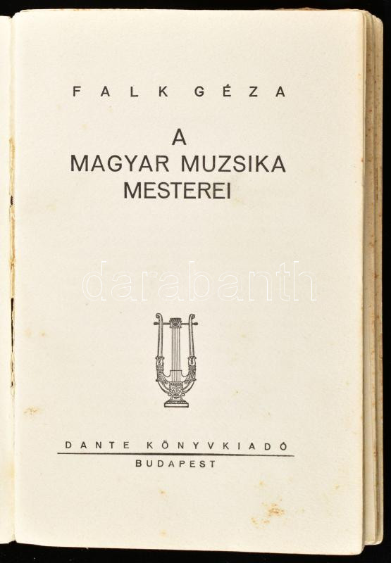 Falk Géza: A magyar muzsika mesterei. Bp., 1937, Dante, 206+(2) p. Első kiadás. Kiadói papírkötés, sérült, szétváló fűzéssel. A szerző, Falk Géza (1899-1945) által Lányi Viktor (1889-1962) zeneszerző, író részére DEDIKÁLT példány.