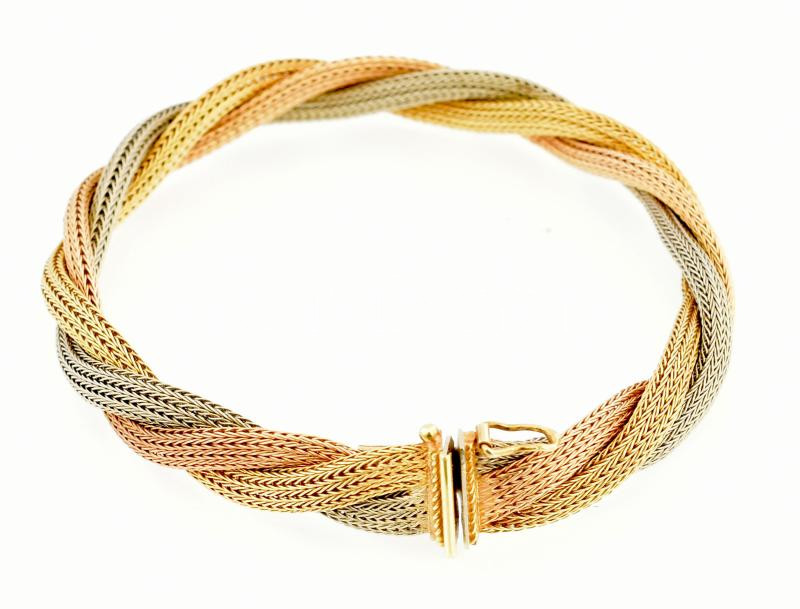 Arany-fehérarany (Au/14k) fonott karkötő, három különböző színnel. Jel... https://www.darabanth.com/hu/441-Gyorsarveres/441.0/Nemesfem-disztargyak-ekszerek-dragakovek/Nemesfem-disztargyak-ekszerek-dragakovek~500051/Arany-feherarany-Au14k-fonott-karkoto-harom-kulonbozo-szinnel-Jelzett-18-g-h-19-cm~II2898707