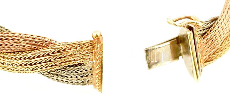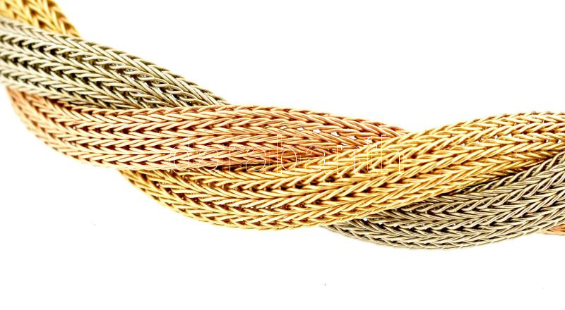 Leírás: Arany-fehérarany (Au/14k) fonott karkötő, három különböző színnel. Jelzett, 18 g, h: 19 cm. Dobozban.