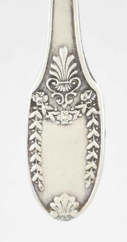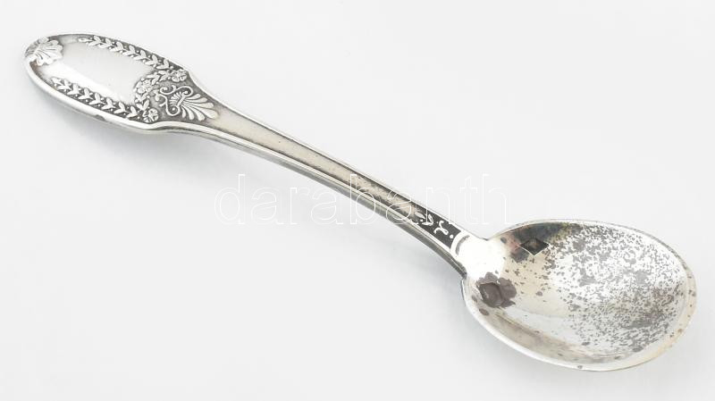 Ezüst(Ag) fűszeres kanál, jelzett, h: 7,5 cm, nettó: 6,9 g https://www.darabanth.com/hu/441-Gyorsarveres/441.0/Nemesfem-disztargyak-ekszerek-dragakovek/Nemesfem-disztargyak-ekszerek-dragakovek~500051/EzustAg-fuszeres-kanal-jelzett-h-7-5-cm-netto-6-9-g~II2900410