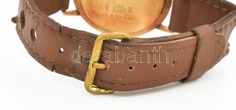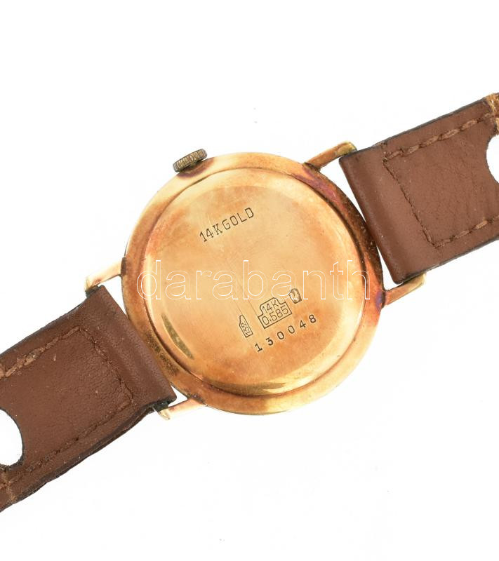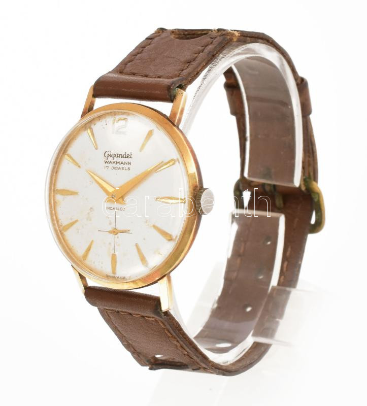 Leírás: Gigandel Wakmann 14K arany karóra, kézi felhúzós, működő, jó állapotban, régi bőr szíjjal 35 mm