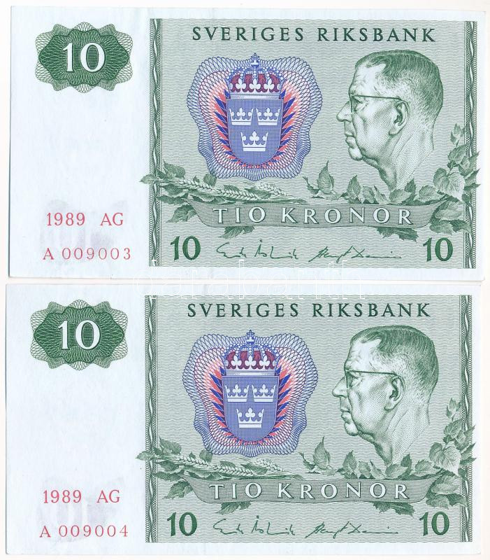 Sweden 1989. 10 Kronor (2x) consecutive serials "A 009003 - A 009004" C:AU