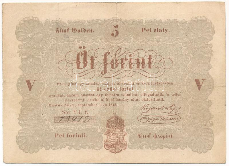 Leírás: 1848. 5Ft "Kossuth bankó" vörösesbarna T:F Adamo G109