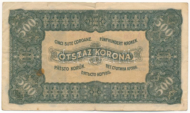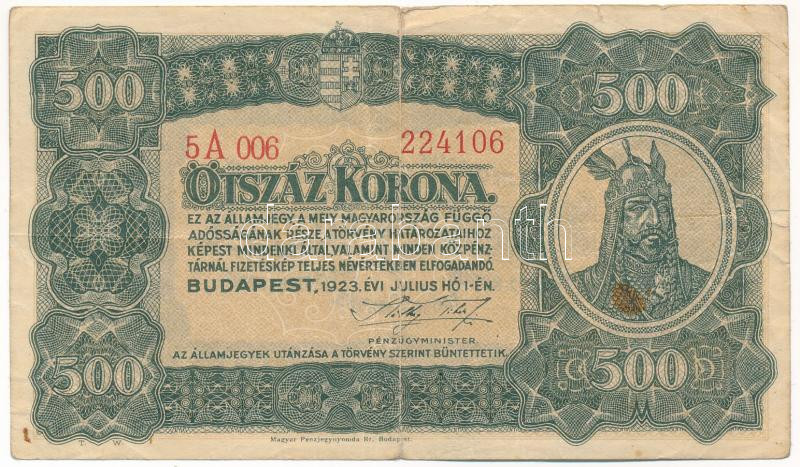 Leírás: 1923. 500K "Magyar Pénzjegynyomda Rt. Budapest" nyomdahely jelöléssel T:F,VG fo. Adamo K34