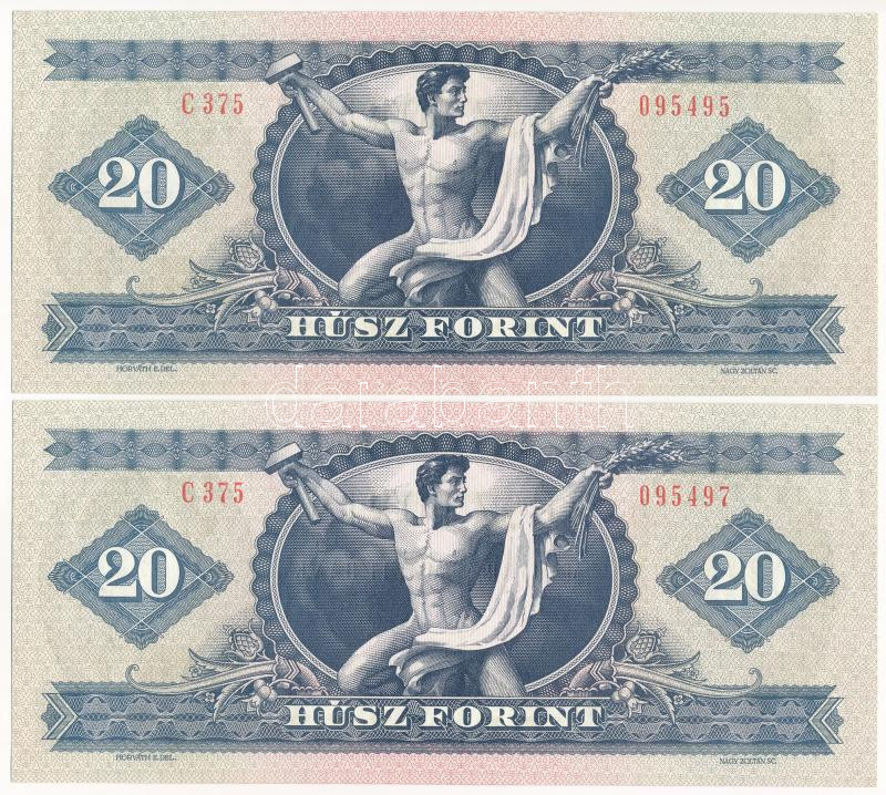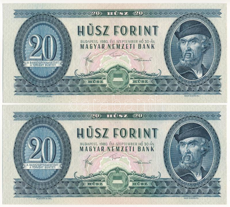 1980. 20Ft (2db) egyugrásos sorszámkövető T:F szép papír https://www.darabanth.com/hu/441-Gyorsarveres/441.0/Numizmatika/Magyar-bankjegyek~2000007/1980-20Ft-2db-egyugrasos-sorszamkoveto-TF-szep-papir~II2896691