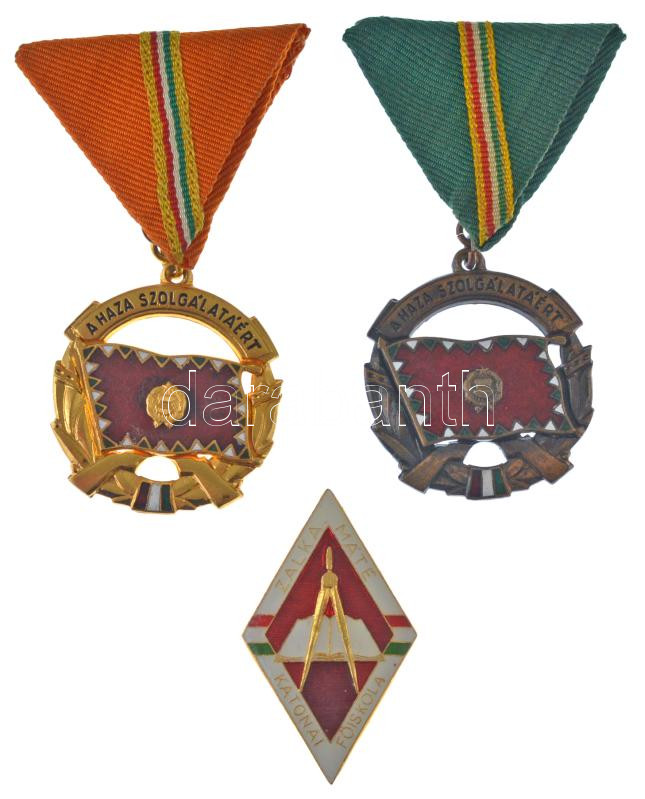 1964. "A Haza szolgálatáért Emlékérem arany és bronz fokozata" (2xklf) aranyozott, zománcozott bronz kitüntetések mellszalagon + DN "Zalka Máté Katonai Főiskola" műgyantás fém jelvény (46x27,5mm) T:AU