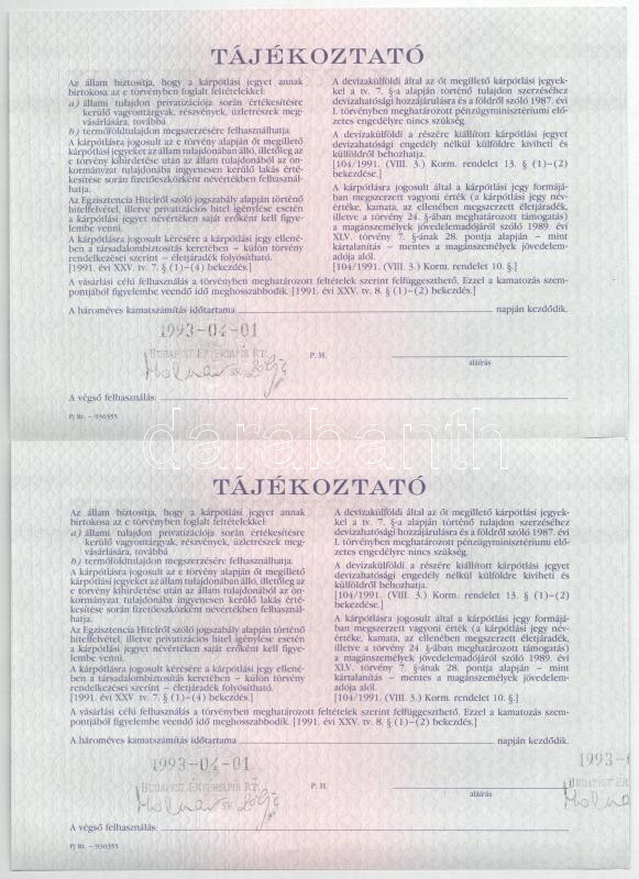 Leírás: Budapest 1991. "Országos Kárrendezési és Kárpótlási Hivatal" kárpótlási jegye 10.000Ft-ról (5x) "F 2625776 - F 2625780" T:AU