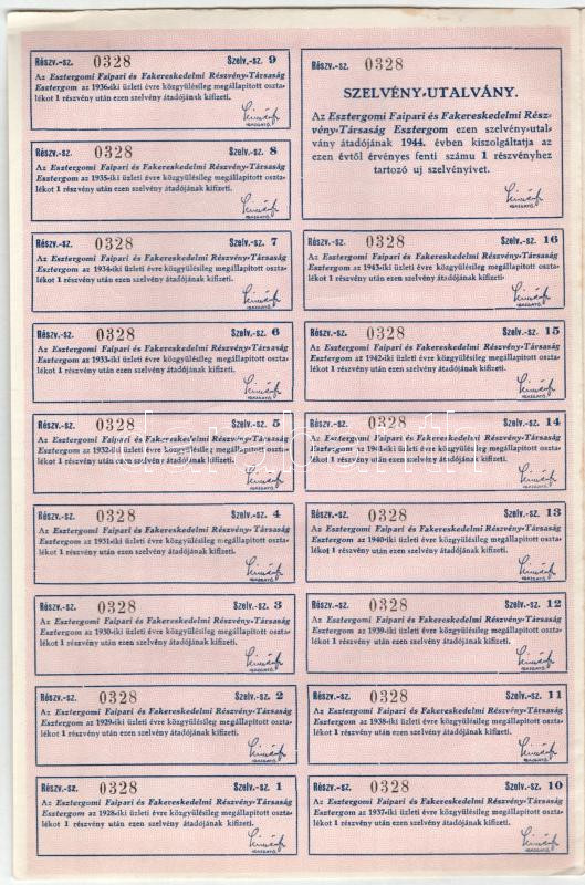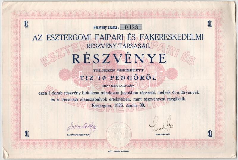 Leírás: Esztergom 1926. "Az Esztergomi Faipari És Fakereskedelmi Részvény-Társaság" részvénye 10P-ről, szárazpecséttel és szelvényekkel T:XF
