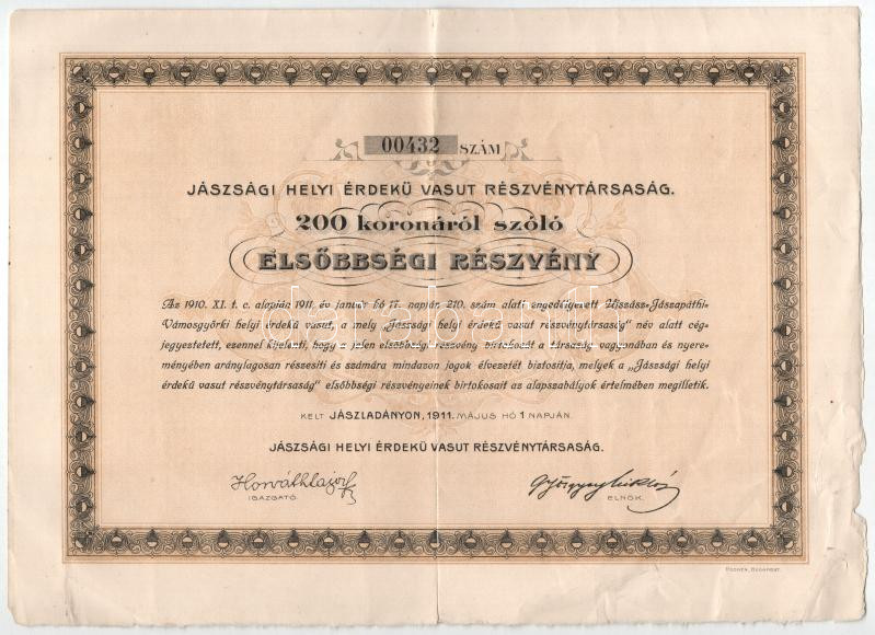 Leírás: Jászladány 1911. "Jászsági Helyi Érdekü Vasut Részvénytársaság" elsőbbségi részvénye 200K-ról T:F nagyobb szakadás