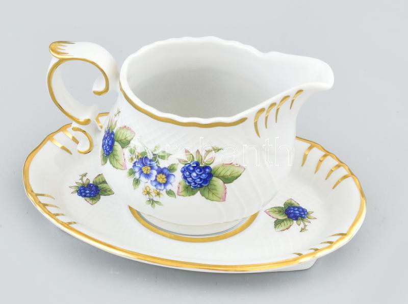 Leírás: Hollóházi áfonyás porcelán kiöntő és alátét. Kézzel festett, jelzett, hibátlan 18x11 cm