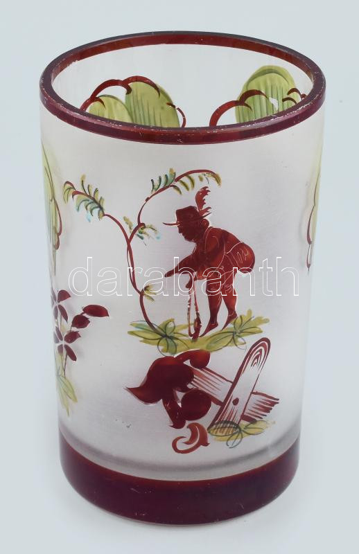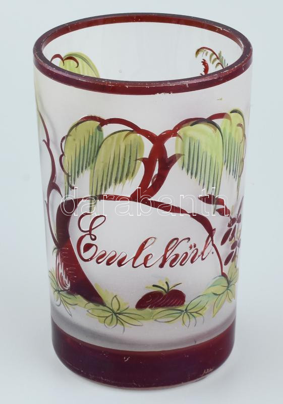 Leírás: Bordó üveg címeres antik emlék pohár. Kézzel festett, szakított, kis kopással 12,5 cm