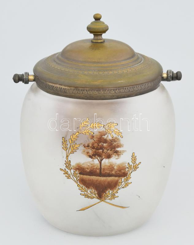 Leírás: cca 1900 Francia üveg keksz tartó, kézzel festett savmaratott üveg, díszes fém szerelékkel, jelzett, hibátlan, m: 19 cm