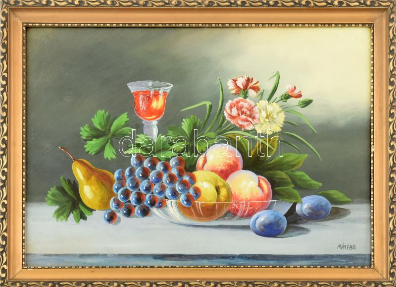 Leírás: Mayer B jelzéssel: Csendélet szilvával. Tempera, karton. Üvegezett fakeretben. 32,5×46,5 cm