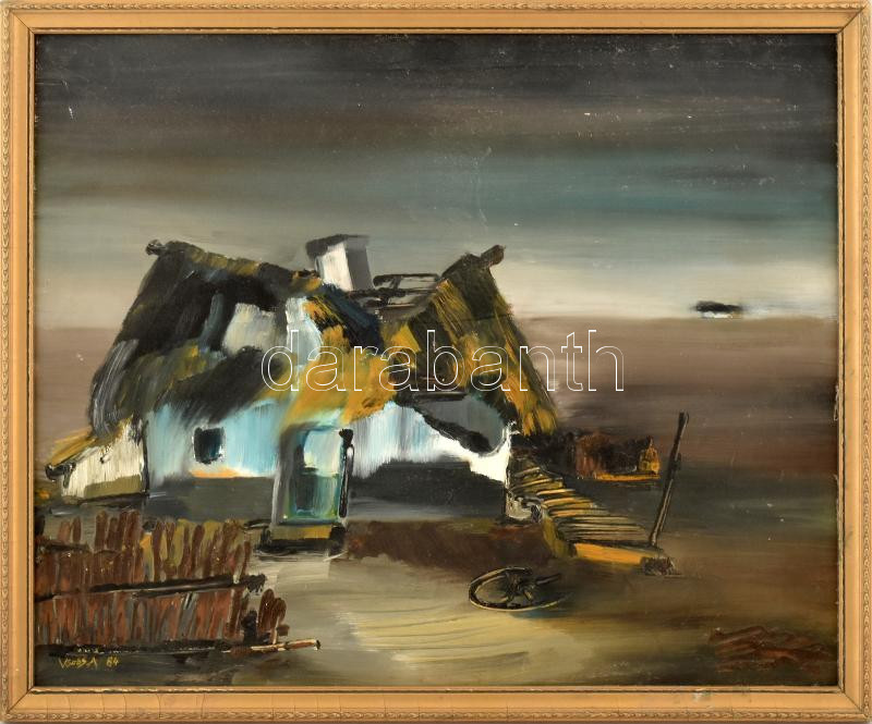 Leírás: Vörös A jelzéssel: Tanya. Olaj, farost, dekoratív fakeretben, 43×54 cm