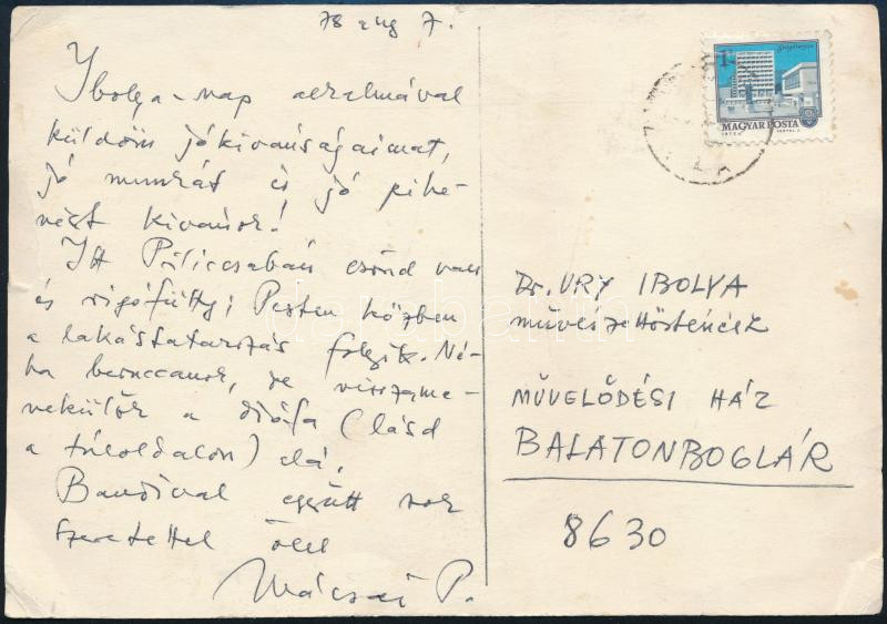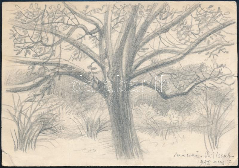 Mácsai István (1922- 2005): Piliscsabai kert, 1978. Ceruza, papír, jelzett, hátoldalán Mácsai István autográf soraival Ury Ibolya (1924-2009), a Műcsarnok tudományos főmunkatársa és férje részére. Levelezőlapként postázva. Lapszéli apró szakadásokkal. Törésnyommal. 12x17 cm