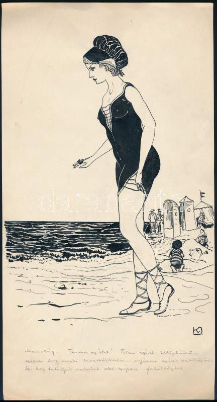 Leírás: Monori Kovács Jenő (1884-?): Hölgy divatos fürdőruhában (karikatúra), 1910 körül. Ceruza, tus, papír, jelzett, 29x15,5 cm