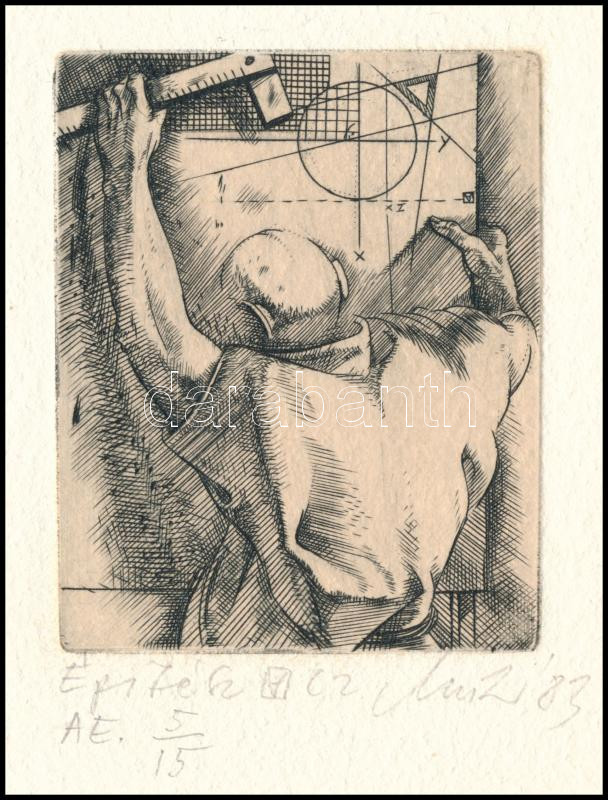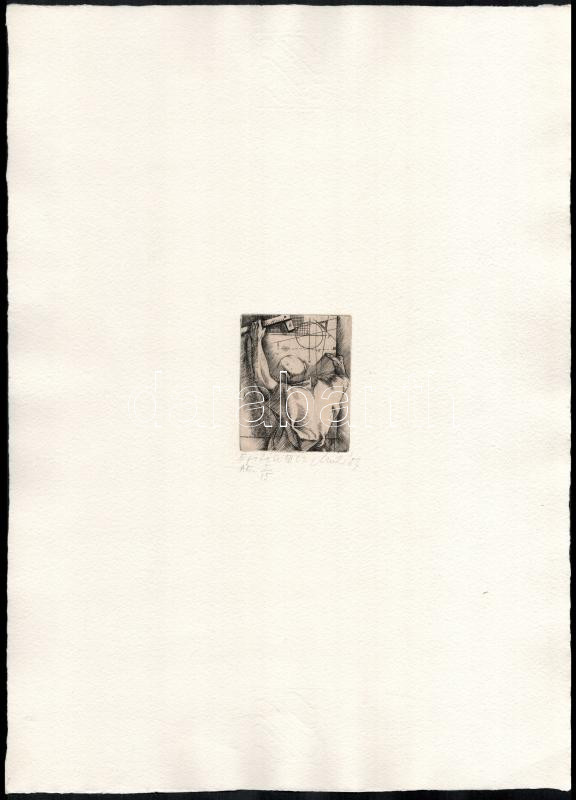 Leírás: Müller Árpád (1961-2006): Építész, 1983. Rézmetszet, merített papír, jelzett, művészpéldány AE 5/15 számozással. 7×5,5 cm.