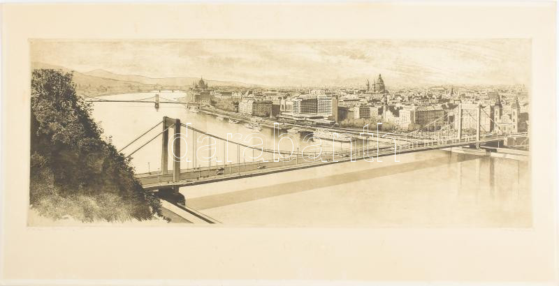 Leírás: Nagy Zoltán (1916-1987): Kilátás a Gellérthegyről (Budapesti panoráma). Rézkarc, papír, jelzett, kartonra kasírozva, kissé foltos, 28×75 cm
