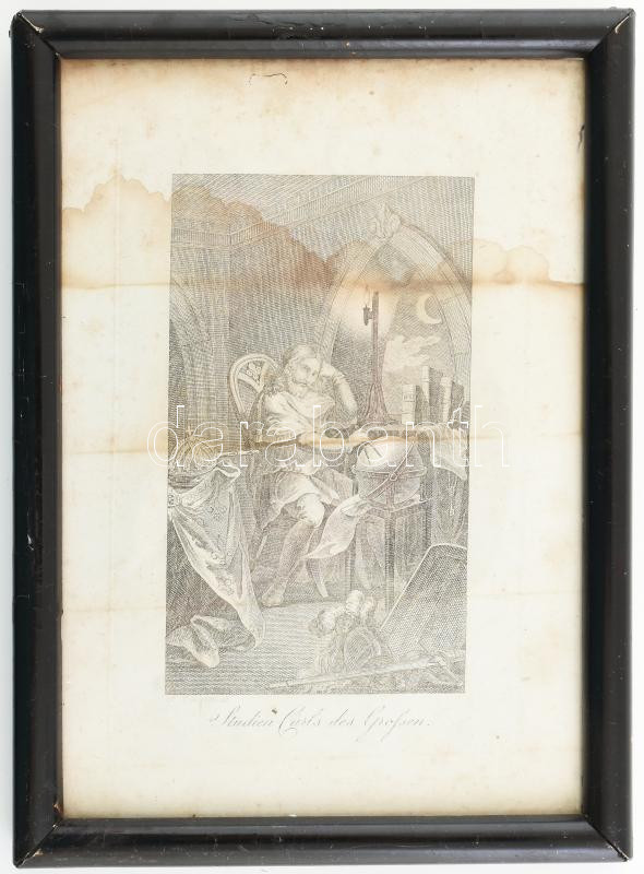 Leírás: Studien Carls des Grossen. Nagy Károly tanulmányai. Rézmetszet, papír, foltos. Üvegezett keretben 9x14 cm