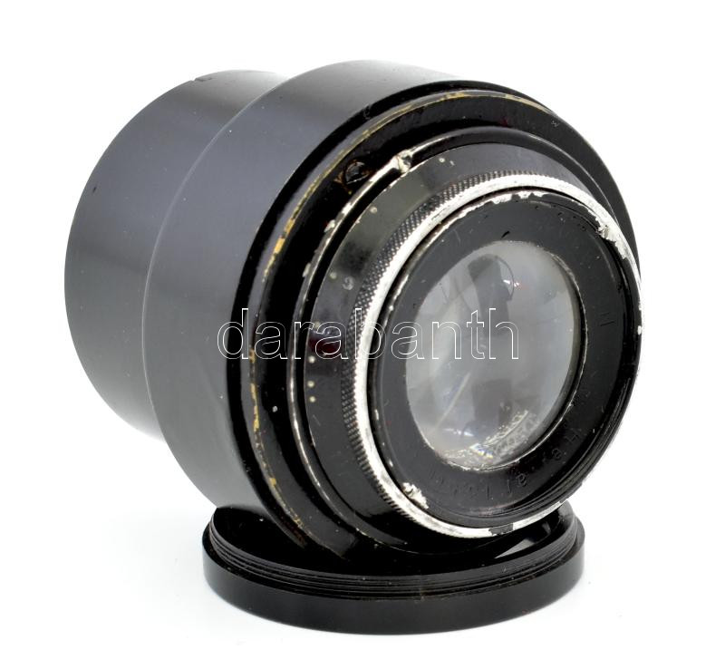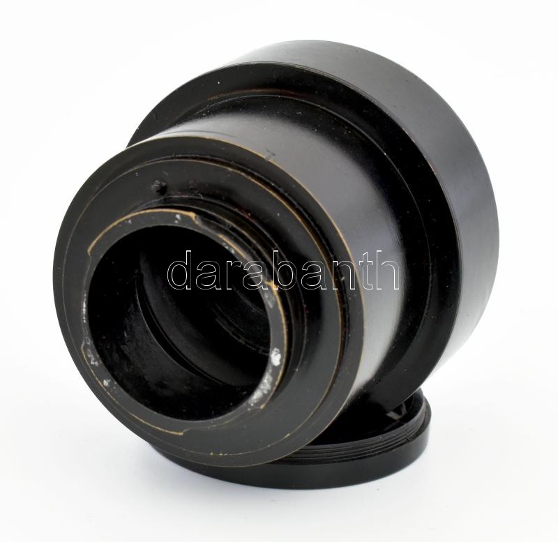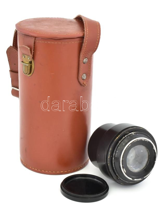 Leírás: Voigtländer Braunschweig Heliar 13,5 cm 1:4,5 (135mm f/4.5) objektív, kisebb kopásokkal (a lencse körül a feliratokat lefestették), bőr tokban