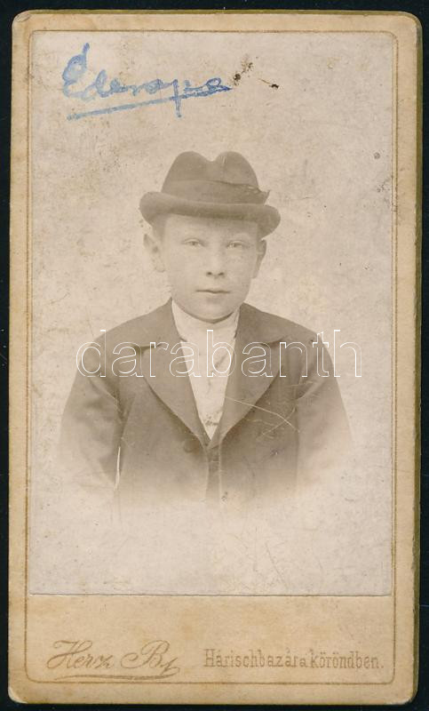 Leírás: cca 1895 Fiú portréja, keményhátú mignon fotó Herz budapesti műterméből, feliratozva, kopásnyomokkal, 8×4,5 cm
