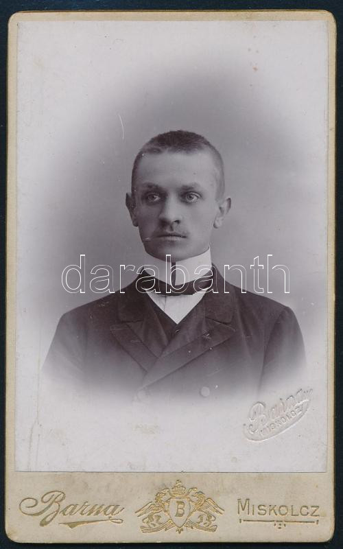 cca 1900 Férfiportré, keményhátú fotó Barna Hugó miskolci műterméből, ... https://www.darabanth.com/hu/442-Gyorsarveres/442.0/Fotomuveszet/Foto~500024/cca-1900-Ferfiportre-kemenyhatu-foto-Barna-Hugo-miskolci-mutermebol-10-5C3976-5-cm~II2908148