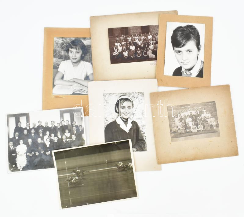 Leírás: cca 1920-1970 Vegyes nagyméretű fotók (portrék, csoportképek, lóverseny), össz. 7 db, vegyes állapotban, 24x18 cm és 15x11 cm között