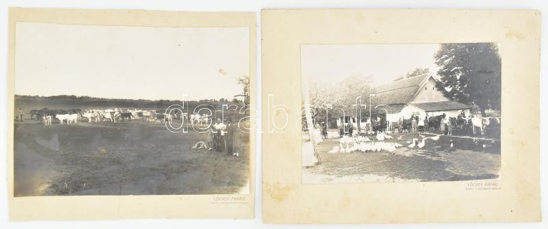 cca 1930-1940 Hortobágyi életképek (parasztcsalád, szarvasmarhák, lovaskocsik, stb.), 2 db nagyméretű, kartonra kasírozott fotó, pecséttel jelzettek (Lőcsey Árpád fényképész felvételei), kissé sérült kartonok, 26,5x19,5 cm és 23,5x16 cm