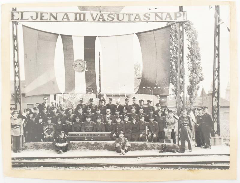 cca 1950 "Éljen a III. Vasutas Nap!", egyenruhás MÁV tisztek csoportképe, Rákosi-címeres zászlóval, molinóval; nagyméretű fotó, kartonra ragasztva, 24x18 cm