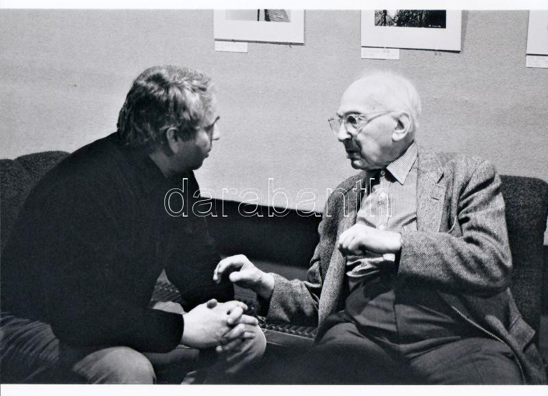 cca 1984 André Kertész (1894-1985) magyar, francia, amerikai fotóművész a FŐFOTÓ Váci utcai Fotógalériájában, ahol kiállítást és könyvbemutatót szerveztek számára; a felvételen dr. Hefelle József (1938-2017) szakíróval és fotóművésszel beszélget, 1 db modern nagyítás, 15x21 cm