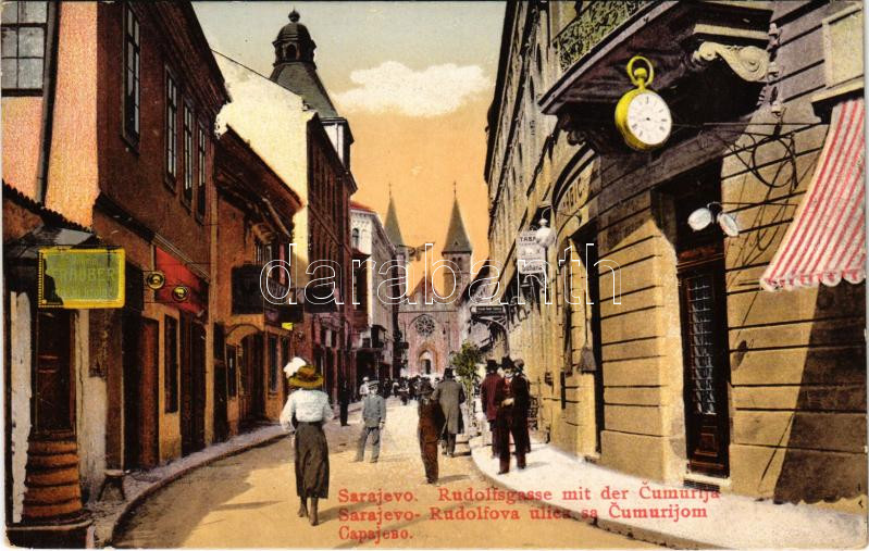 Leírás: Sarajevo, Rudolfova ulica sa Cumurijom, Tabak, Trauber / street, shops (EK)