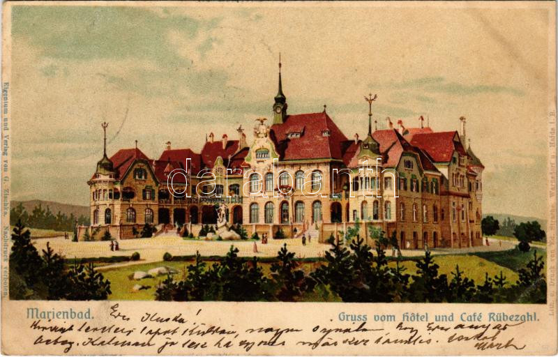1909 Marianske Lazne, Marienbad; Gruss vom Hotel und Cafe Rübezahl. G.... https://www.darabanth.com/hu/442-Gyorsarveres/442.0/Kepeslapok/Cseh-Koztarsasag~2000027/1909-Marianske-Lazne-Marienbad-Gruss-vom-Hotel-und-Cafe-Rubezahl-G-Zischka-Art-Nouveau-litho~II2864516