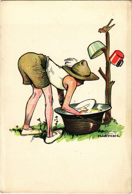 Leírás: Mosogató cserkész. A Magyar Cserkészszövetség kiadása / Hungarian boy scout art postcard s: Márton L. (fa)