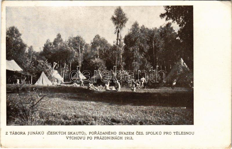 Leírás: Z Tábora Junáku (Ceskych Skautu), Porádaného svazem ces. spolku pro telesnou vychovu po prázdninách 1913 / Cseh cserkész tábor Junák / Tábor Junák (Czech Scouts) (EK)