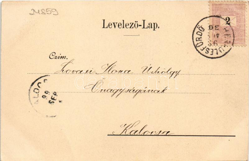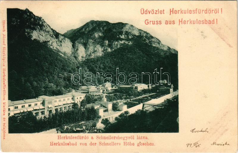 1899 (Vorläufer) Herkulesfürdő, Herkulesbad, Baile Herculane; Herkulesfürdő a Schnellershegyről látva. Hirsch József fényképész kiadása / Herkulesbad von der Schnellers Höhe gesehen / general view, spa (vágott / cut)