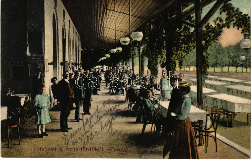1908 Félixfürdő, Baile Felix; Vendéglő, étterem terasza vendégekkel és... https://www.darabanth.com/hu/442-Gyorsarveres/442.0/Kepeslapok/Erdely~2000007/1908-Felixfurdo-Baile-Felix-Vendeglo-etterem-terasza-vendegekkel-es-pincerekkel-Engel-J~II2893755