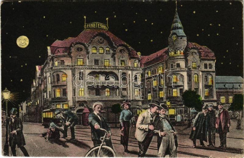 1910 Nagyvárad, Oradea; Fekete Sas szálló éjjel, villamosok. Humoros montázs részeg férfiakkal. Benkő Artur kiadása / hotel at night, trams. Humorous montage with drunk men (EB)