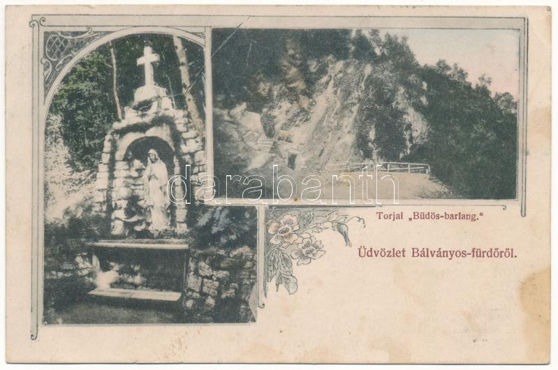 1912 Bálványosfürdő, Bálványosfüred, Baile Bálványos (Torja, Turia); Torjai büdös-barlang, Szűz Mária szobor. Divald Károly Fia kiadása / cave, Virgin Mary statue. Art Nouveau, Floral (fl)