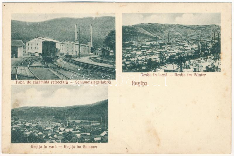 Resica, Resita; Fabr. de caramida refrectara, in vara, in iarna / Schamotziegelfabrik, im Sommer und im Winter / Tűzálló téglagyár, nyáron és télen. Schwarz Otto Nr. VIII. 1928. / fireclay brick factory, in summer and in winter (fl)