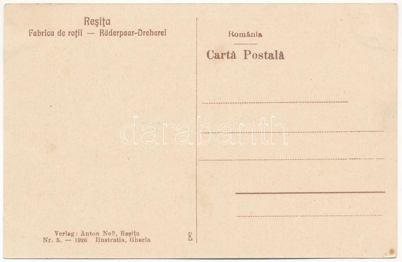 Resica, Resita; Fabrica de rotii / Räderpaar Dreherei. Anton Neff 1926... https://www.darabanth.com/hu/442-Gyorsarveres/442.0/Kepeslapok/Erdely~2000007/Resica-Resita-Fabrica-de-rotii-Raderpaar-Dreherei-Anton-Neff-1926-Nr-5-kerekgyar-belso~II2890128