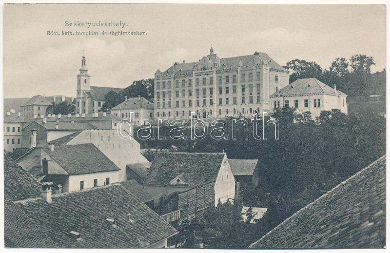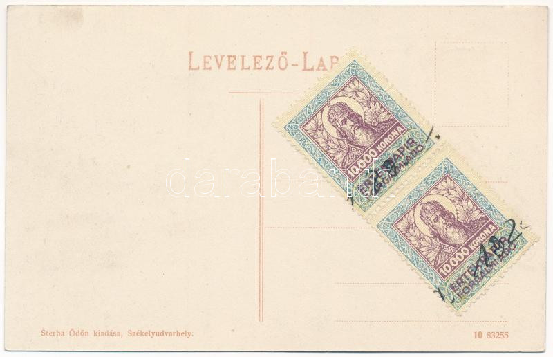 Székelyudvarhely, Odorheiu Secuiesc; Római katolikus templom és főgimnázium. Sterba Ödön kiadása / church, grammar school + "2 db Értékpapír Forgalmi Adóbélyeg, 10.000 Korona"