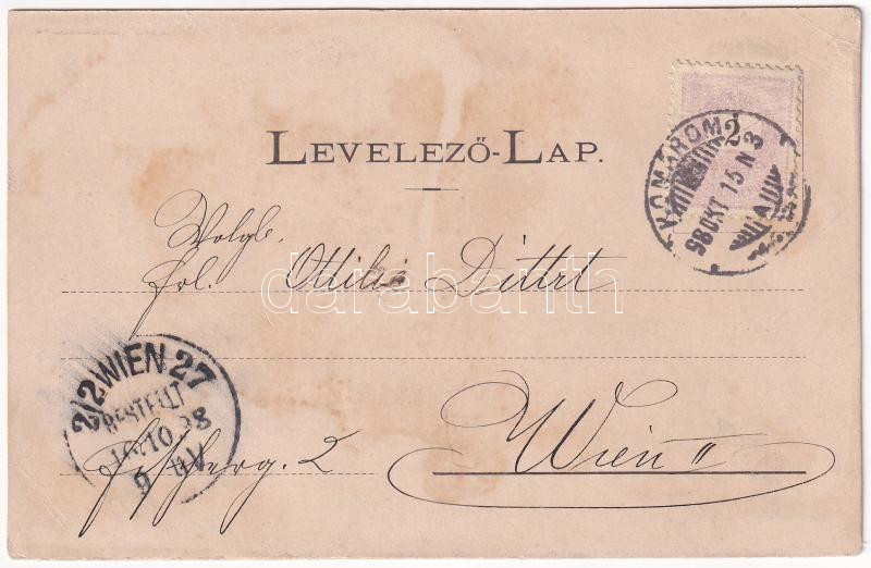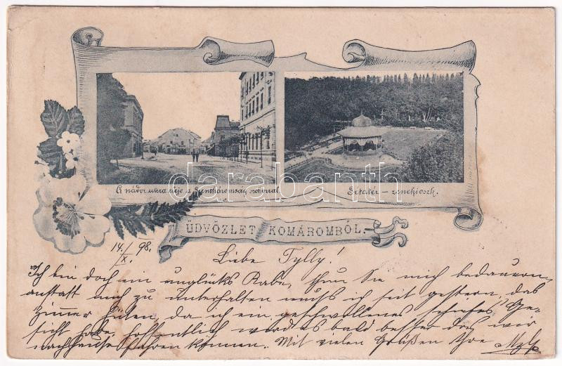 Leírás: 1898 (Vorläufer) Komárom, Komárnó; Nádor utca eleje, Szentháromság szobor, Sétatér / street, Trinity statue, promenade. Art Nouveau, floral (EK)