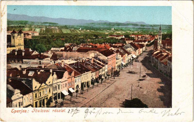 Leírás: 1900 Eperjes, Presov; Fő utca, üzletek. Cattarino Sándor kiadása / general view, shops (EB)