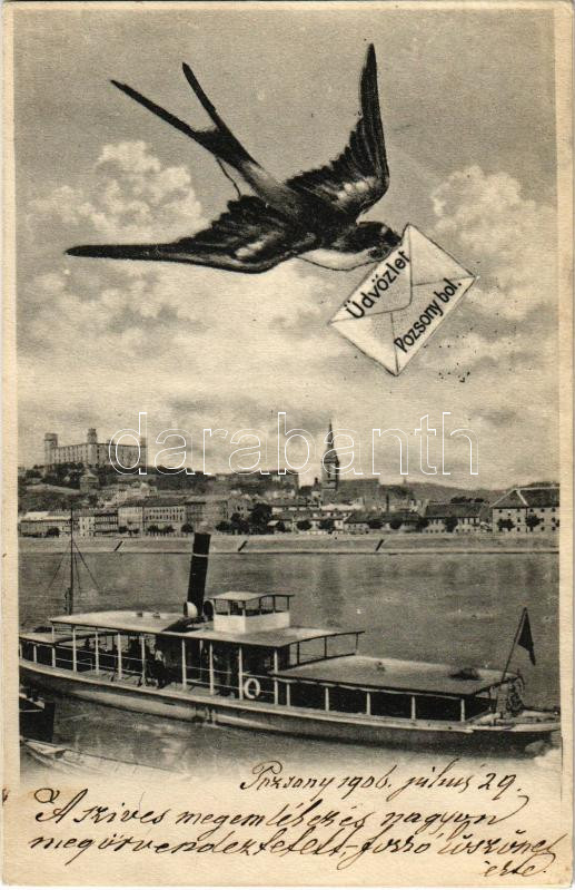 1906 Pozsony, Pressburg, Bratislava; vár, gőzhajó. Fecskés üdvözlő mon... https://www.darabanth.com/hu/442-Gyorsarveres/442.0/Kepeslapok/Felvidek~2000008/1906-Pozsony-Pressburg-Bratislava-var-gozhajo-Fecskes-udvozlo-montazs-castle-steamsh~II2908357