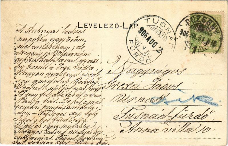 Leírás: 1906 Pozsony, Pressburg, Bratislava; vár, gőzhajó. Fecskés üdvözlő montázs / castle, steamship. Greeting montage with swallow (r)