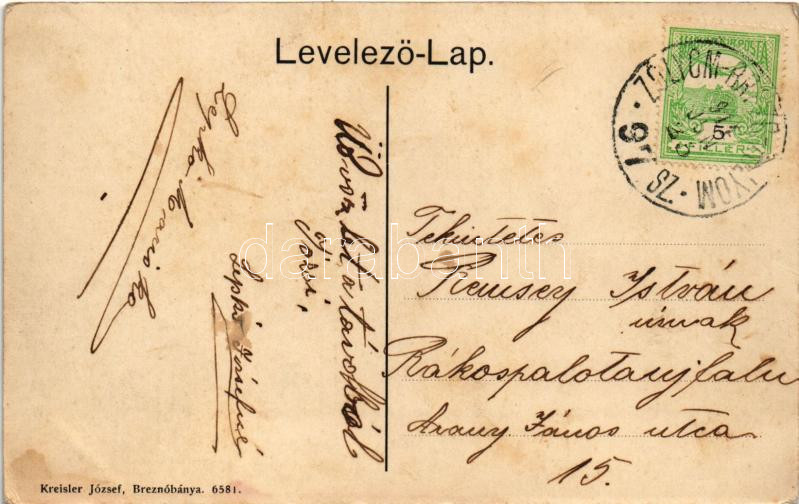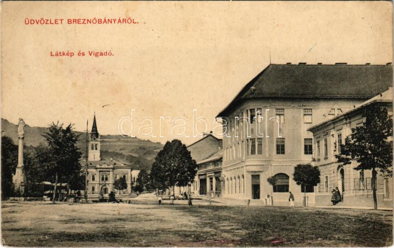 1911 Breznóbánya, Brezno nad Hronom; látkép és Vigadó, tér, templom. Kreisler József kiadása / redoute, square, church + "ZÓLYOM - BREZNÓBÁNYA 97. SZ." vasúti mozgóposta bélyegző (fl)