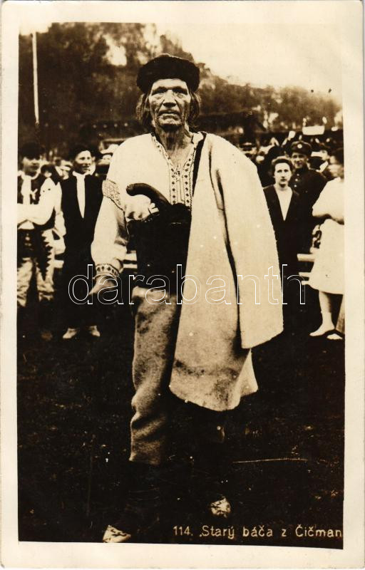Csicsmány, Cicmany; Stary baca z Cicman / Felvidéki népviselet, öreg p... https://www.darabanth.com/hu/442-Gyorsarveres/442.0/Kepeslapok/Felvidek~2000008/Csicsmany-Cicmany-Stary-baca-z-Cicman-Felvideki-nepviselet-oreg-pasztor-Upper-Hungarian-~II2910884